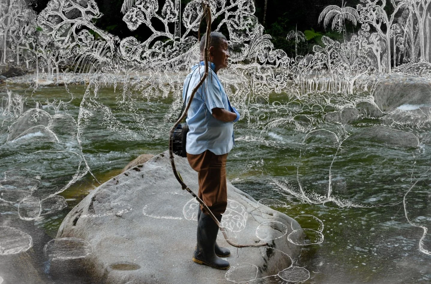 Aurelio Vargas sobre el rio piatua, Foto de Andres Yepez, intervenida por Daling Kaniras archivo Piatua Resiste